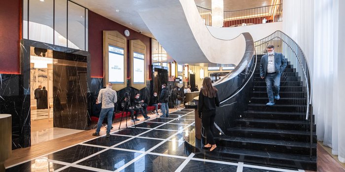 Настоящим украшением интерьеров кинотеатра стала спроектированная Шехтелем историческая лестница, облицованная светлым мрамором.