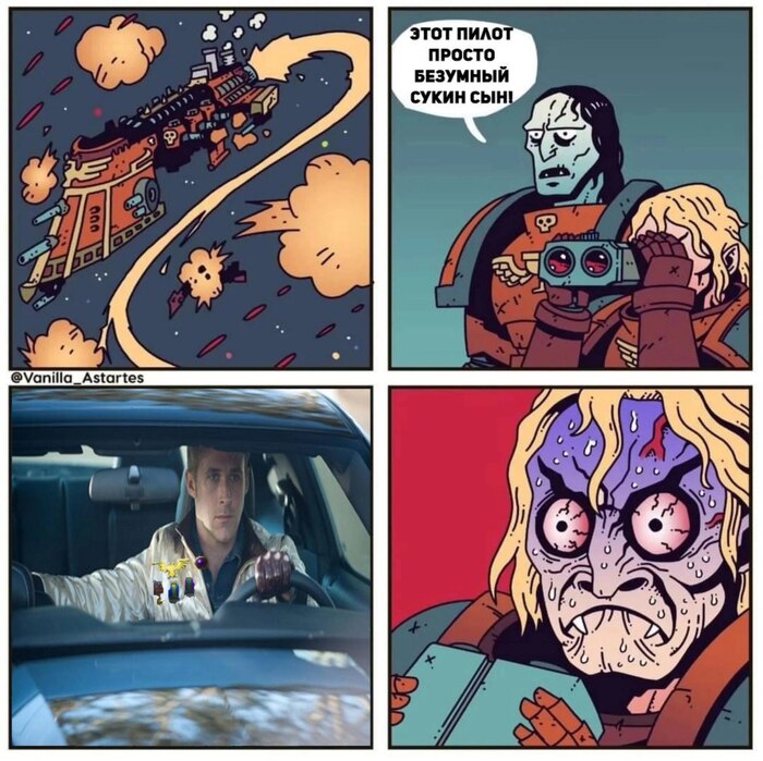 Сангвиний: Из твоих уст всё звучит как угроза. Эти астартес выглядели так, будто бы сейчас обоссутся от страха. А ведь ты просто попросил их отойти, чтобы мы могли пройти. У меня так не получается, никто не воспринимает мои угрозы серьёзно, даже если я очень стараюсь звучать угрожающе.