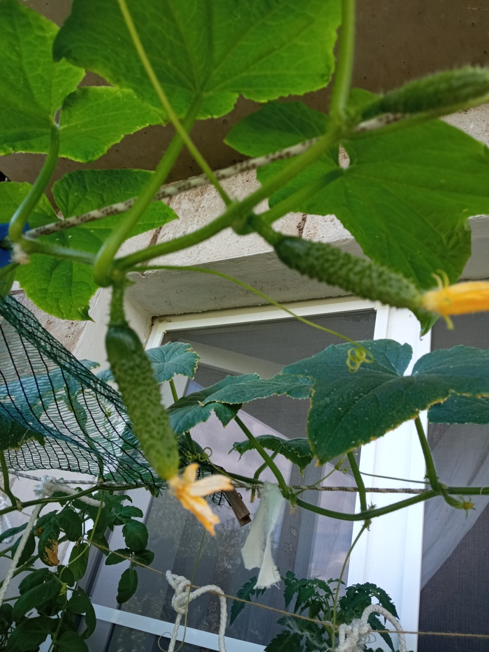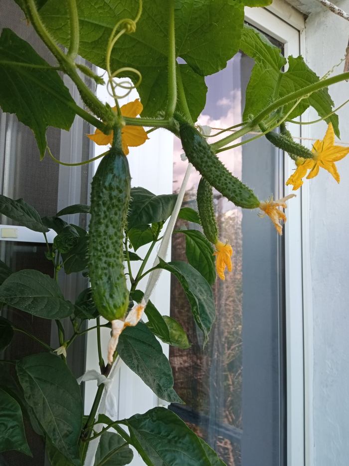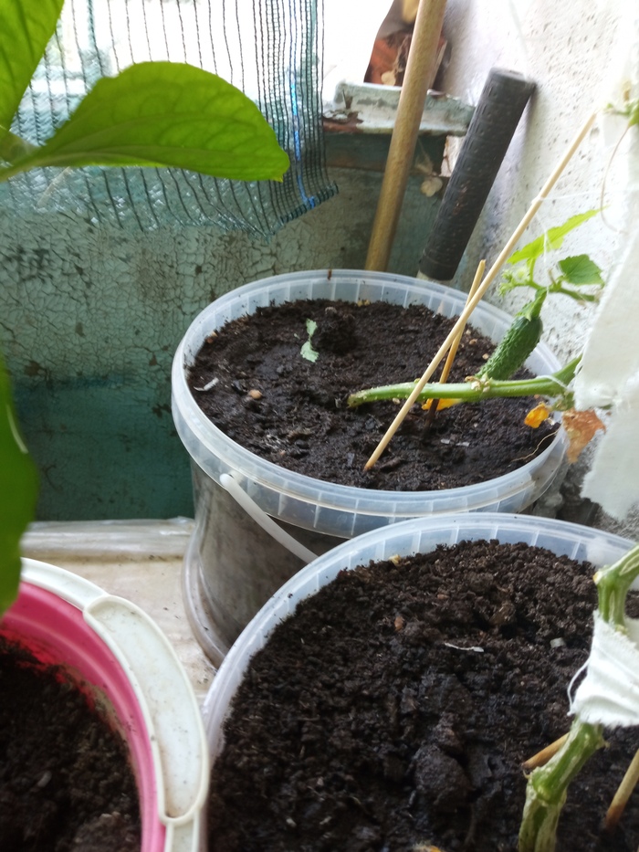 Причём, пускают новые веточки , и на них новые огурчики. Удобряю, по-прежнему, всём подряд. И представляю себе, сколько же было бы у меня огурцов, если бы мы не напортачили с поливом. Ох-ох-ох. Ну уж в следующем году! Держите меня семеро! Развернусь, жаль королевство, в смысле балкон, маловато!!!