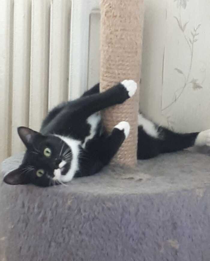 Одна - чернышка с белыми лапками и пузиком, Фрося. Что примечательного — у неё очень забавной окраски мордочка, из-за чего кажется, будет у неё дополнительные покрученные усы🤭