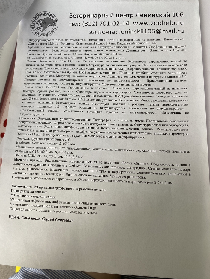 На основании этих показателей и наших слов о рвоте, врач предположила гастрит и выписала Квамател. Рвота практически исчезла, была редкой. Спустя месяц после лечения снова сдали кровь: АЛТ - 430, ЩФ - 220. Нас направили на узи брюшной полости, по результатам которого врач предположил портальную гипертензию. Однако потом остановилась на том, что в первой клинике ему дали слишком высокую дозу дексаметазона и повредили печень. Выписал витамин Е, по 0,3 мл в день, 30 дней. Спустя 30 дней мы пришли на повторный прием и узи.
