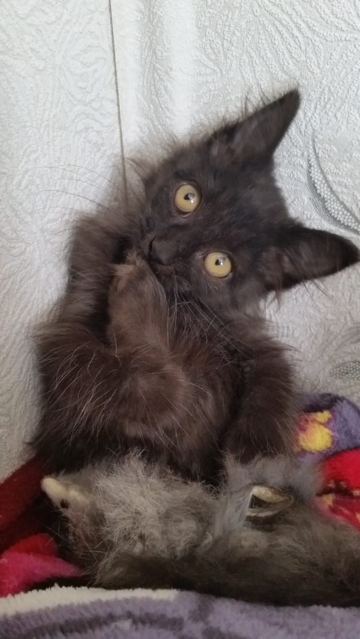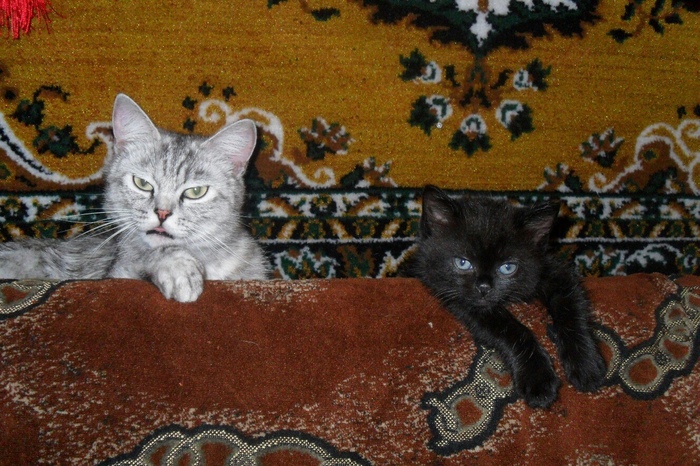 Чёрный кот, самый крикливый и неуёмный, прожил со мной где-то полтора года. Он отличался наглостью, вечным неистовым ором и привязанностью. Всегда ждал меня с учёбы на подоконнике окна, по приходу домой с наглым видом лез на руки, валялся в ногах и ласкался. Отказов он не воспринимал. Мог двинуть мне лапой, но что интересно никогда не пускал всерьёз когти с зубами. К сожалению жизнь его закончилась очень скоротечно от неудачной прививки после серьёзной болезни.