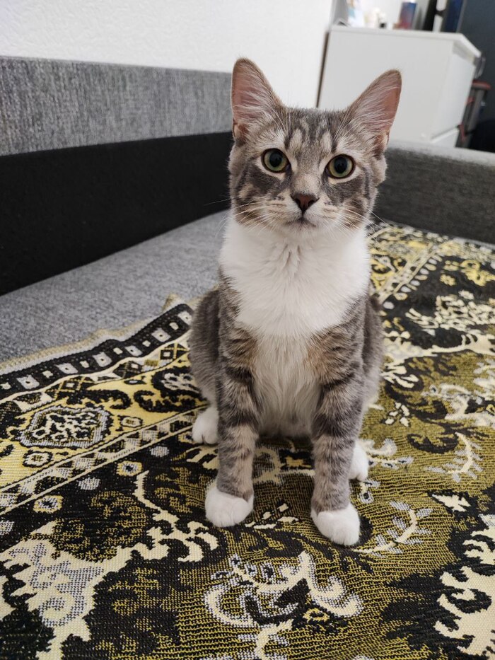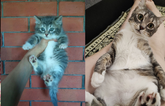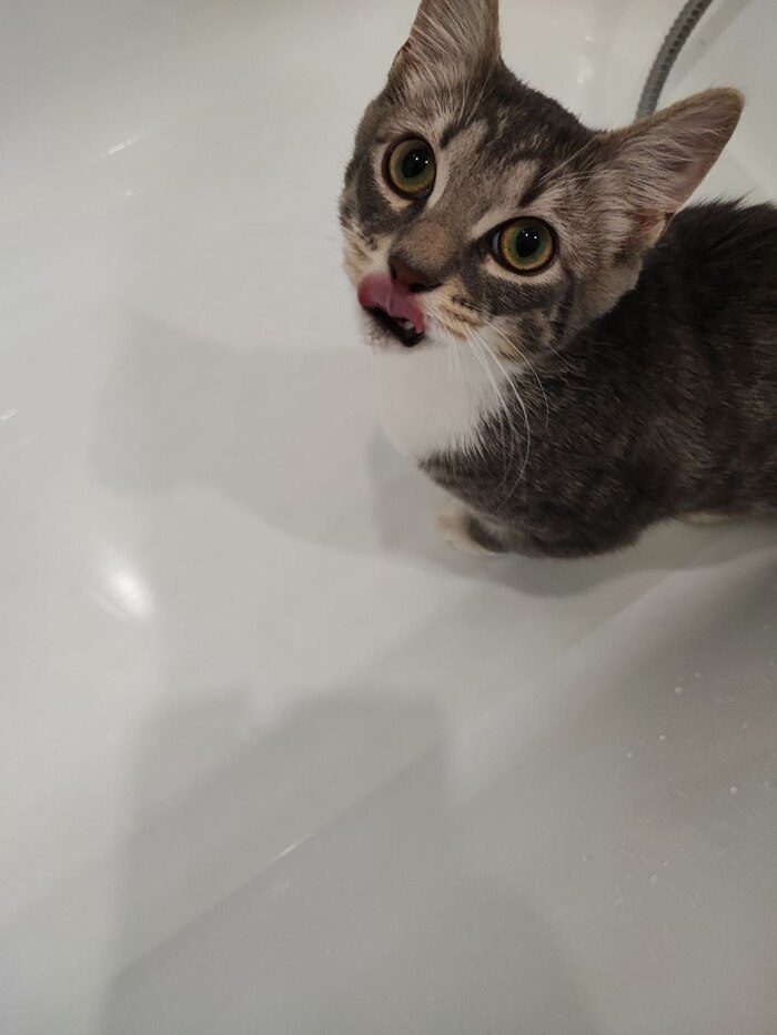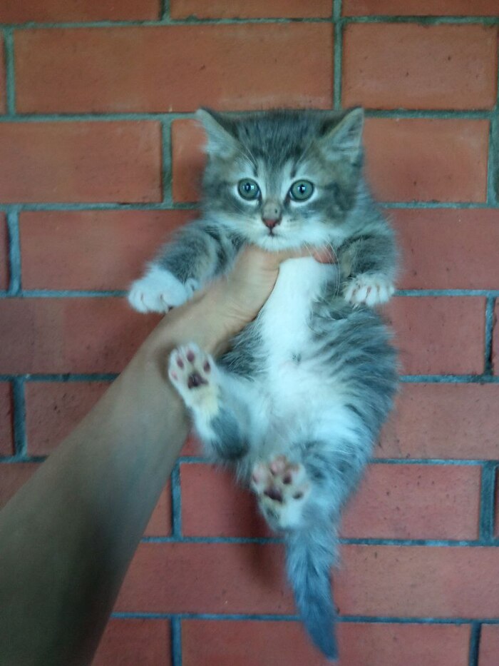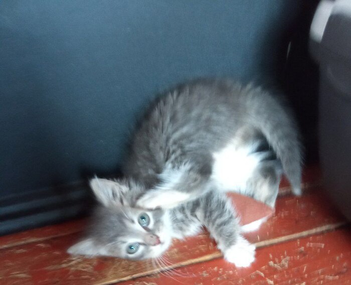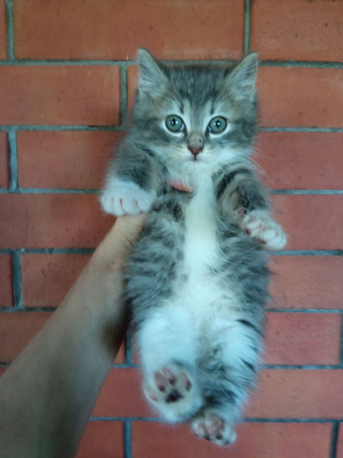 21.11 на ул.Колесовой, на железной решётке замерзал котёнок. Кричал от холода на всю улицу. Пришлось взять домой.Кошечке от 4-6 недель. Ушки чистые, без клеща.Вчера, после помывки, наблюдала блох, но не много. Покапала на холку Инспектора, от блох и гельминтов. Окрас в два цвета.Серый и бледно рыжий. Сегодня киска полакала молоко и ела мягкий корм для котят.Диковата. Ещё в стрессе. Вероятно родилась в подвале. Короткошёрстная. Болячек нет. Укусов насекомых тоже не прощупывала. Активная. Ножки не отморозила.С лотком, как обстоят дела не знаю.