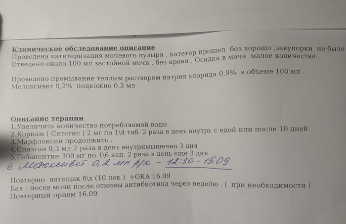 Три дня назад у кота начались проблемы с мочеиспусканием. Отказывается или не может пописать - копается в горшке, присаживается, но тут же встаёт и так по несколько раз. 3.09 мы ездили в клинику по поводу тошноты и расстройства желудка, поставили диагноз - воспаление кишечника, назначили лечение: марфлоксин, Энтерофурил, диета (royal canin hipoallergenic). Лечение помогло и до 11 числа никаких проблем со стулом или мочеиспусканием небыло. 12 числа ездили в вет.клинику, где кота осмотрели, сделали УЗИ, поставили катетер и слили мочу, сдав ее на анализ. Сказали, что была закупорка уретры, но не сильная. Из лекарств прописали диету, габапентин - успокоительное и марфлоксин - антибиотик (его назначали ранее из-за проблем с кишечником). 13 числа кот так и не сходил в туалет, но был весел, аппетит был хороший, воду пил. Сегодня, 14 числа, снова поехали в вет.клинику. Его снова осмотрели, сделали УЗИ - по УЗИ все чисто, мочевой наполнен сильно. Снова слили мочу спомощью катетера, поставили обезболивающее. Из назначений добавили колоть Спазган 0,3 мл, Корнам 2мг по 1/4 таблетки. Купила ему ошейник с феромонами. Говорят, что проблема скорее не физиологическая а психологическая.