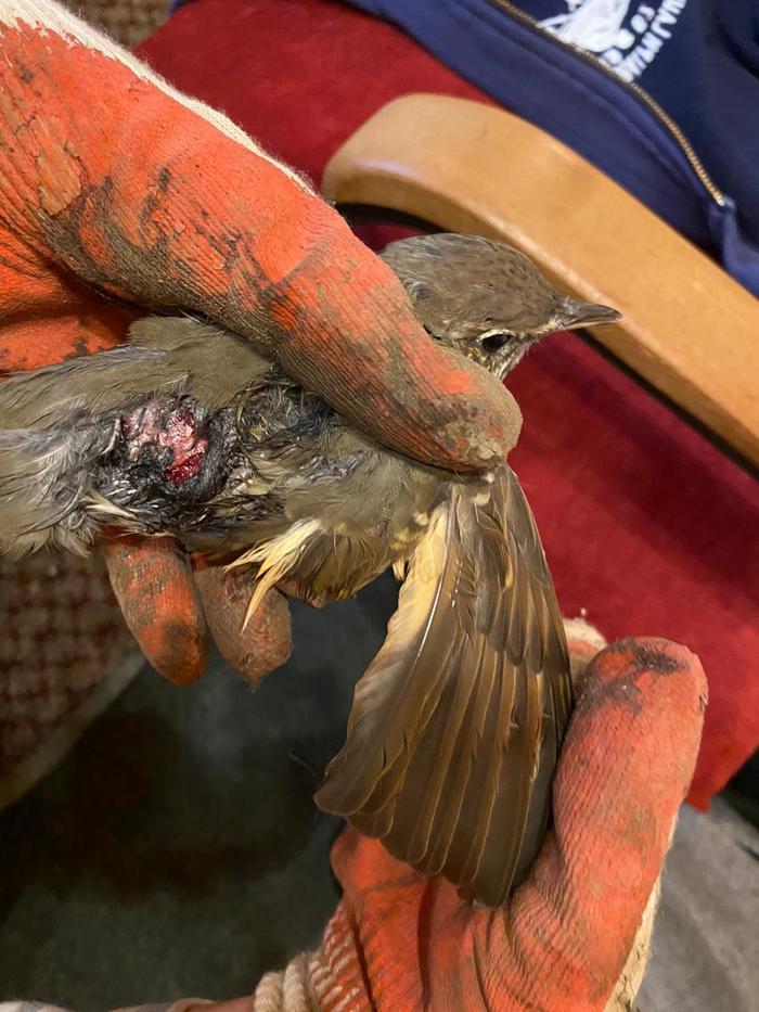 Обработал ранку перекисью, рассмотрел что есть проблема с крылом и кажется выдран хвост, сейчас ищу орнитолога поблизости