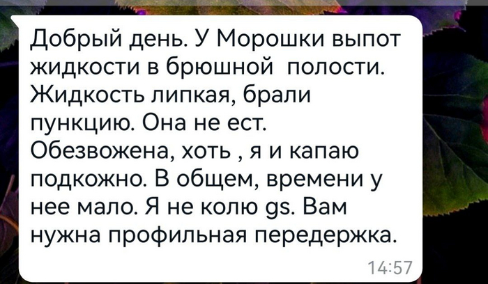 Сейчас ситуация особенно сложная не только для Морошки, но и для всей нашей команды. Наш куратор, который всегда отвечал за организацию помощи, тоже тяжело болен и находится в больнице, а у нас на попечении шесть кошек, и у каждого — свои потребности и тяжелые случаи. У Морошки выпот жидкости в брюшной полости, она обезвожена и почти не ест. Времени у неё остаётся очень мало — девочка на глазах слабеет и нуждается в постоянной поддержке❗️