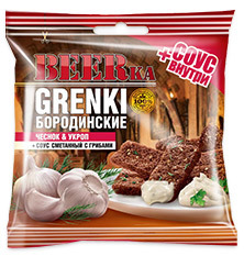 И последний экземпляр - Гренки. Просто "Гренки". От компании "Пивные радости", которая также выпускает "свиные ушки". У них (гренок, не ушек) есть замечательный вариант (к сожалению, только один) с чесноком, в котором нет ни одного консерванта или какой-нибудь ненатуральной добавки (судя по составу), а в упаковке можно найти кусочки сушёного чеснока. Правда, эти гренки и стоят дороже.