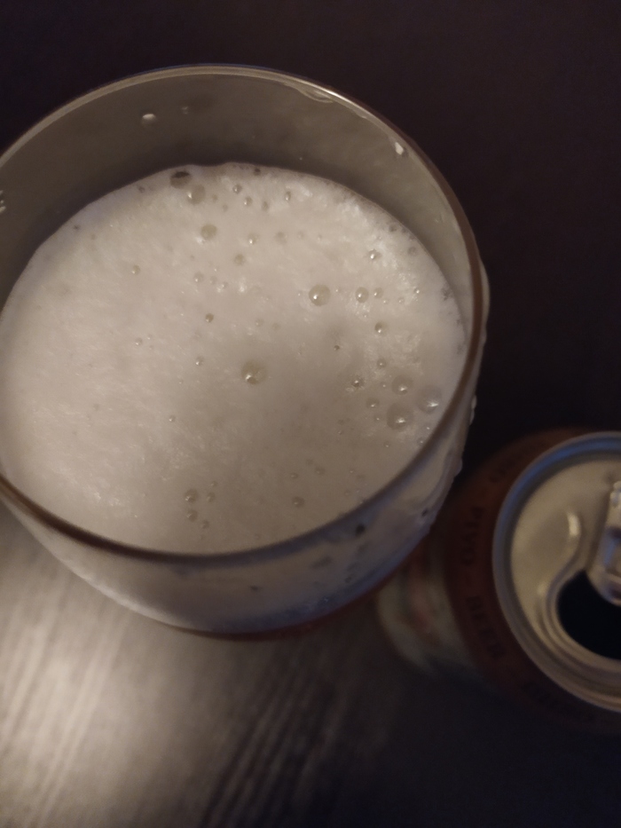Пены много, липнет к бокалу. Шарики пены смотрите. Отверстие банки для налива расширено.