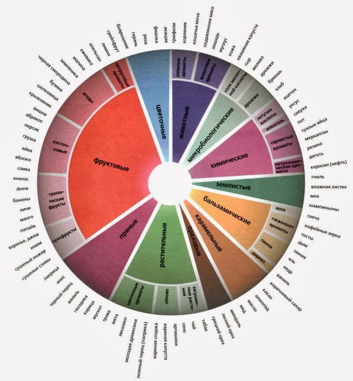 А вот обычные потребители спорить об ароматах будут всегда, так как у нас не одна на всех химическая лаборатория в носу, а очень, во-первых, разный порог чувствительности к содержанию ароматических веществ, а во-вторых - у каждого своя система ассоциаций в ароматике, мне, например, сложно будет убедить жителя Самоа, что вино имеет явный аромат черноплодной рябины, он с ней не сталкивался никогда, а на крайнем севере крайне сложно с ходу ассоциировать аромат с маракуйей, так как это не то чтобы фрукт ежедневного потребления. Для французов аромат «грибов» - это шампиньоны, а для меня, извините, это белый гриб, и нам друг друга не понять). Поэтому каждый кто хочет стать сам себе сомелье - должен наработать собственные ассоциации, в чем методики оценки WSET (Wine & Spirit Education Trust) и колесо ароматов (и то и другое гуглится мгновенно) - в помощь. Вот такое например. Но лучше WSET, на сайте есть все методики, колесо больше для домашнего использования.