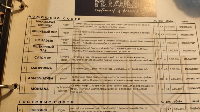 По понедельникам (свои сорта по 200р за 0.5) и средам ("1 + 1 = 3" на свои сорта) неплохие акции. Кухня в принципе тоже ничего. На конец мая на карте стояли такие сорта. В фаворитах у меня - Вишневый Пир. Смородину еще не пробовала, Catch Up по ощущением среднячок. Плюсы: - честные 0.5! А не 0.4, как в большинстве мест. - своя пивоварня. Часть чанов стоят и работают прямо на входе. Претензий к качеству пива нет, часто отмечаем там дни рождения. - есть достаточно много гостевых сортов на кранах (включая баночное)