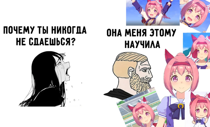 На картинке изображена Хару Урара - персонаж игры Девушки-пони (Umamusume). Её прообразом является одноименная 29-летняя лошадь, которая участвовала в скачках 113 раз и ни разу не победила. Для японцев, лошадь стала символом того, что они никогда не сдаются.