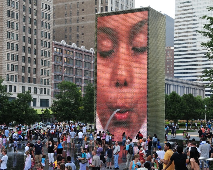 Каждый день Фонтан Крауна развлекает прохожих, транслируя около 1000 видео с чикагцами, представляющими различные сообщества и возрастные группы.