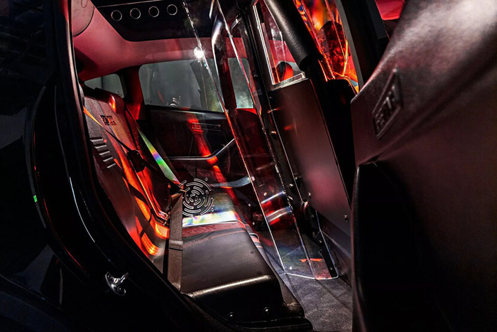 На крыше появились проблесковые маячки, в пороги и багажную дверь встроили стробоскопы аналогичных цветов, а экстерьер дополнили кастомными черными колесными дисками с внедорожными шинами. Салон изменили более серьезно, сделав задний диван конструктивно более простым, с обивкой из легко моющихся материалов и отделив его от переднего ряда сидений защитной перегородкой.