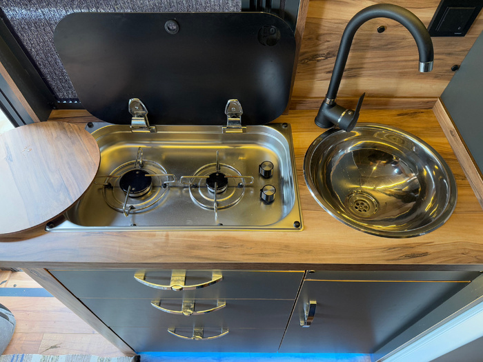 Газовая плита, мойка, ящики для посуды и продуктов, всё как в обычном кастенвагене, но пара особенностей есть.