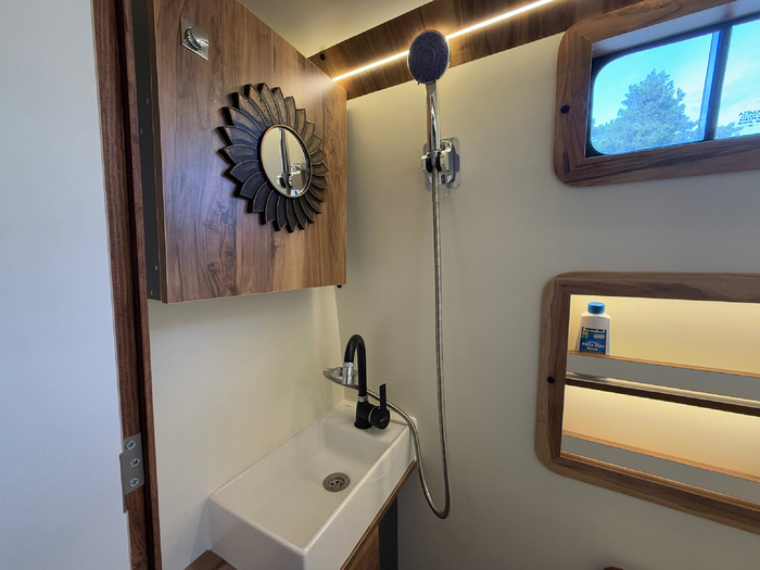 Здесь тоже всё сделано красиво и необычно. Душ, биотуалет, умывальник, шкафчик, полки. Для всего нашлось место. Не повернется язык сказать, что туалетная комната просторная. Она ровно того размера, чтобы гостиная была просторная, а основная спальня позволяла ложиться вдоль фургона взрослому человеку.