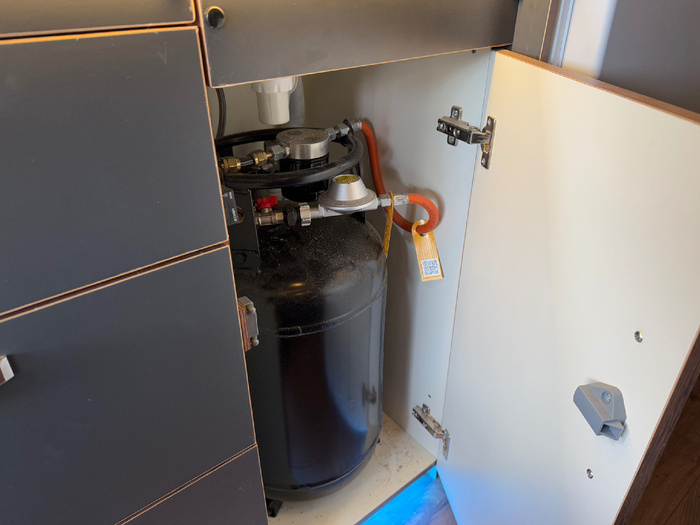 Под мойкой в большом шкафу установлен газовый баллон. Он заправляется снаружи через внешнюю розетку на любой АГЗС.
