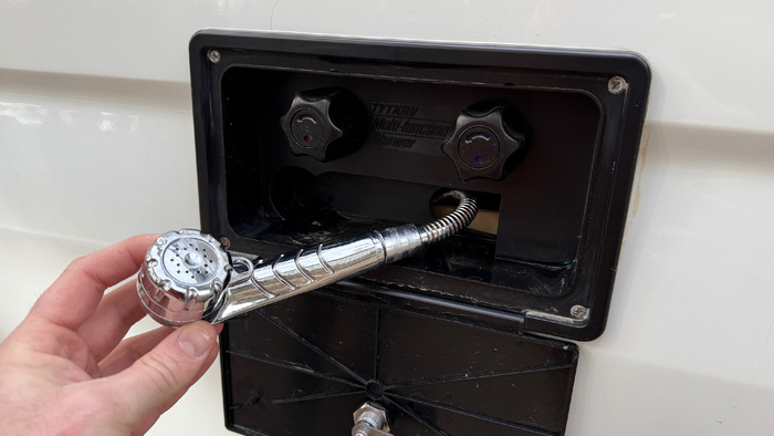 По правому борту установлен лючок с внешним душем. Есть горячая и холодная вода.