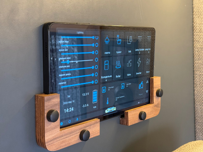 Все оборудование автодома управляется с планшета. Приложение можно установить на любой ваш девайс. Это современный и удобный способ посмотреть остаток воды, зарядку аккумуляторов, включить необходимое оборудование.