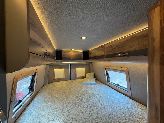 По периметру полки для хранения вещей, на входе гардероб. Освещение, как и во всем салоне, настраивается по яркости и цвету. По бортам встроены двойные окна с антимоскитными сетками и шторами. Открываются и фиксируются в нужном положении для проветривания. Рамки окон выполнены из дерева.