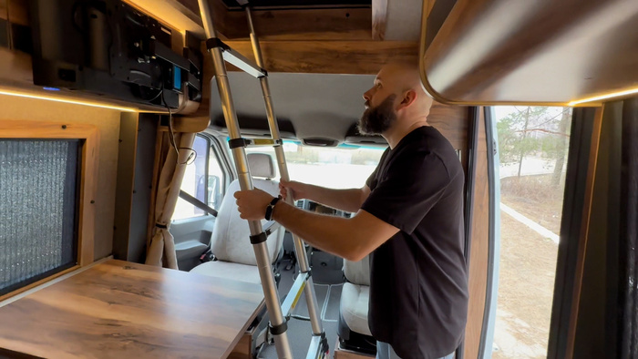 Чтобы забраться наверх, понадобится телескопическая лестница. Обычно она хранится в багажнике, но в сложенном состоянии много места не занимает.