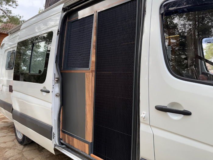 У пассажиров боковое окно оставили штатным, поэтому оно не открывается. Рамка окна из дерева, плиссированная штора органично вписывают окно в интерьер. Зимой одинарное окно определенно будет мостиком холода, поэтому для поездки в низкие температуры я бы изготовил или заказал теплый мат под размер окна, чтобы снизить потери тепла.