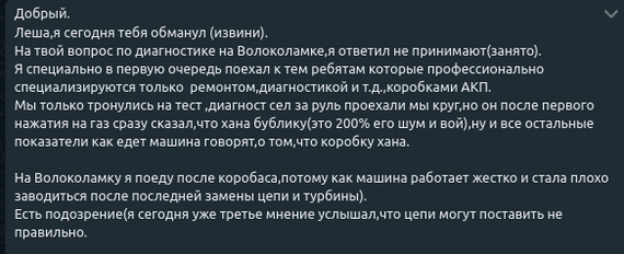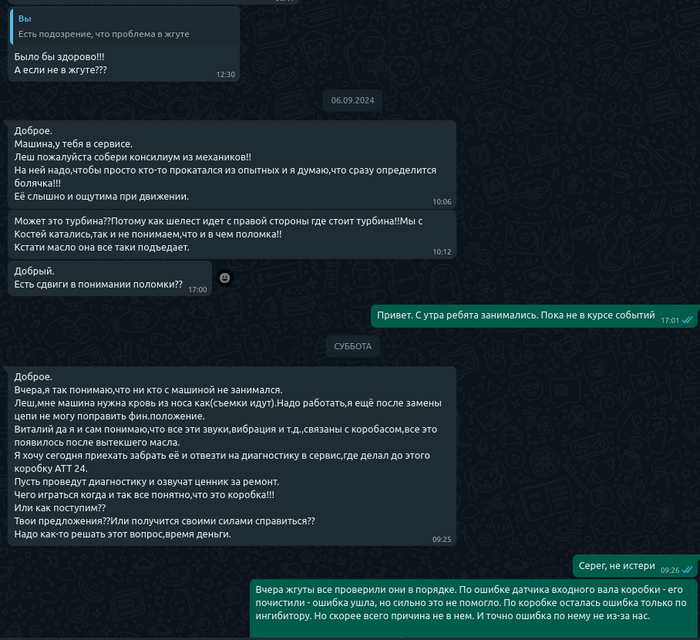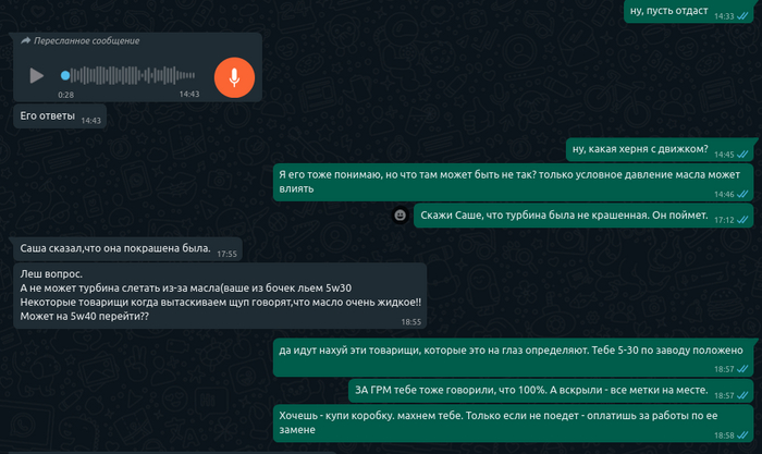 По переписке Саша - это мастер с другого сервиса, который турбину перебирал. Знаем друг друг друга давно, когда-то он у меня даже арендовал место в старой локации. У него был свой прикол - он турбины перед отдачей красил с балончика для внешнего вида. Отшучивался, что если не покрасить - обязательно вернется по гарантии. В общем, свой ритуал был. Поэтому я в переписке пошутил на эту тему. Ну, и под конец я уже психанул немного, так как меня последние дни реально прессовали звонками и смс-ками чуть ли не каждые полчаса, выдвигая все новые и новые теории, которые непременно сводились к одному - хана коробасу!