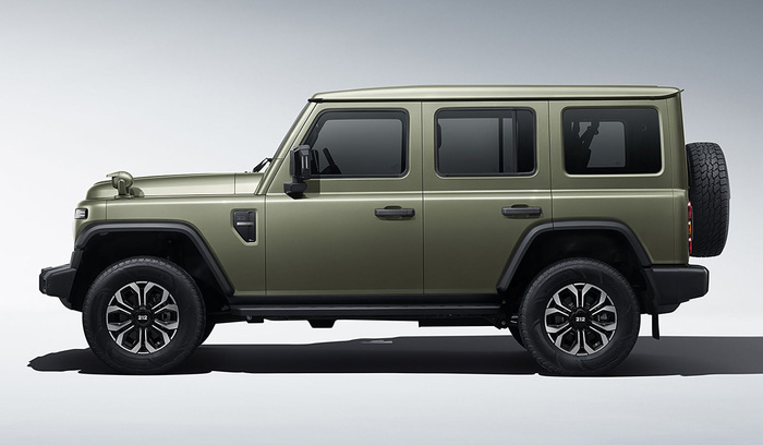 Подобно Гелендвагену, второе поколение китайского вездехода бережно сохранило узнаваемые черты предшественника. Полностью металлический кузов обладает фамильной поясной линией, выступающими крыльями, характерным капотом в виде перевернутой раковины и круглыми фарами (но со светодиодным наполнением). Сохранен даже такой сугубо армейский атрибут, как маскировочная фара-искатель на левом переднем крыле, хотя она тоже стала светодиодной.