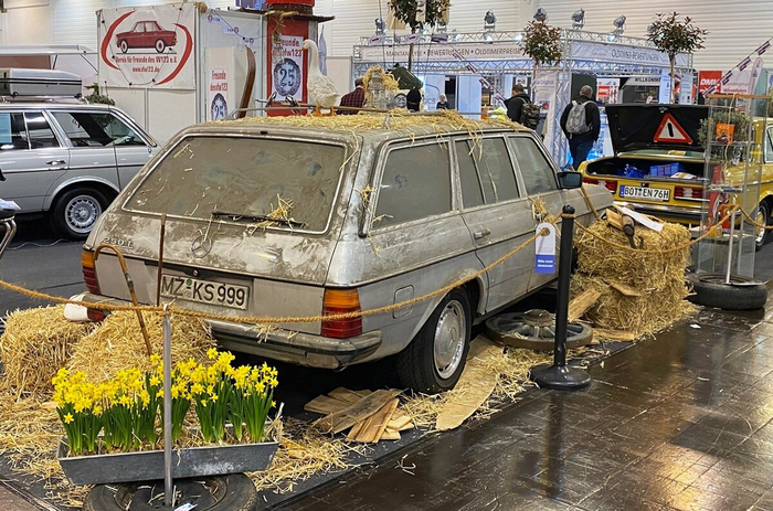 Среди идеально наполированных машин на стендах дилерских контор особенно круто смотрится вот такая инсталляция на сюжет «находка капсулы времени в сарае». В главной роли на стенде «Ассоциации друзей W123» — универсал Mercedes-Benz 250 T откуда-то из Майнца. Машина с карбюраторной рядной «шестёркой» не ранняя и не поздняя: примерно 78-82 года выпуска, ещё с круглыми фарами. Кстати, цветы настоящие, а вот гусь на крыше — нет. На заднем плане видно аналогичный серебристый универсал, уже прошедший реставрацию.