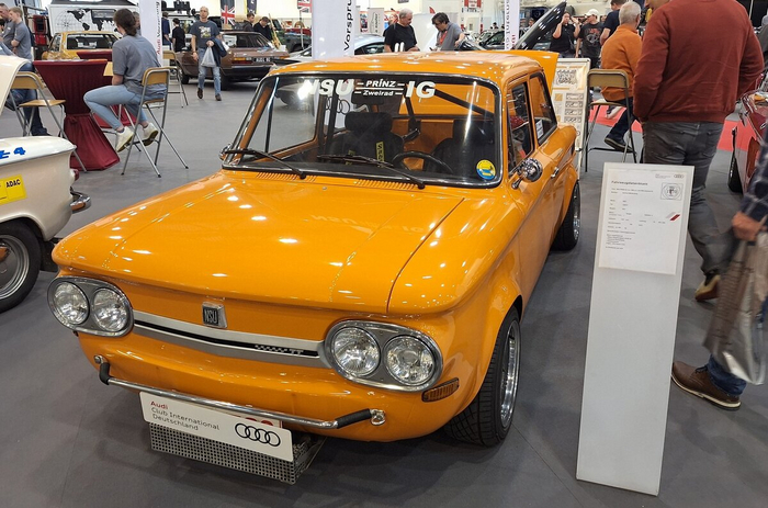 Гоночный «Запорожец»? Конечно, нет: это небольшой заднемоторный седанчик Prinz забытой немецкой марки NSU — а точнее, его спортивная версия 1200 TT. Четырёхцилиндровый рядный двигатель воздушного охлаждения установлен сзади поперечно: в данном случае это мотор объёмом 1177 кубов, с завода развивавший 65 л.с. Не так уж и мало, учитывая крохотную массу машины — 685 килограммов. А на этой машине мотор снабжён парой горизонтальных карбюраторов Weber и наверняка выдаёт больше: в своё время тюнеры выжимали из него до 130 л.с.! Машина пользовалась популярностью у спортсменов-любителей, да и в профессиональных кольцевых гонках была заметна. В 1969 году компания NSU влилась в состав концерна Volkswagen.