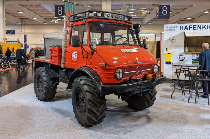 Полноприводный Mercedes-Benz Unimog — одна из легенд Германии: полу-грузовик, полу-трактор. В стране бессчётное количество клубов владельцев, и почти на каждой «Техно-Классике» вы встретите такие машины. А в этом году «Универсальному моторному агрегату» — именно так расшифровывается название — исполняется 75 лет. Перед нами нарядный Unimog 406: такие грузовики выпускались более 25 лет, с 1963 по 1989 год. Судя по наклейкам на дверях и канатам на грузовой платформе, раньше он помогал швартовать корабли в порту Бремена. Для убедительности владельцы грузовика даже притащили на выставку прицеп-ларёк для моряков, когда-то стоявший в порту.