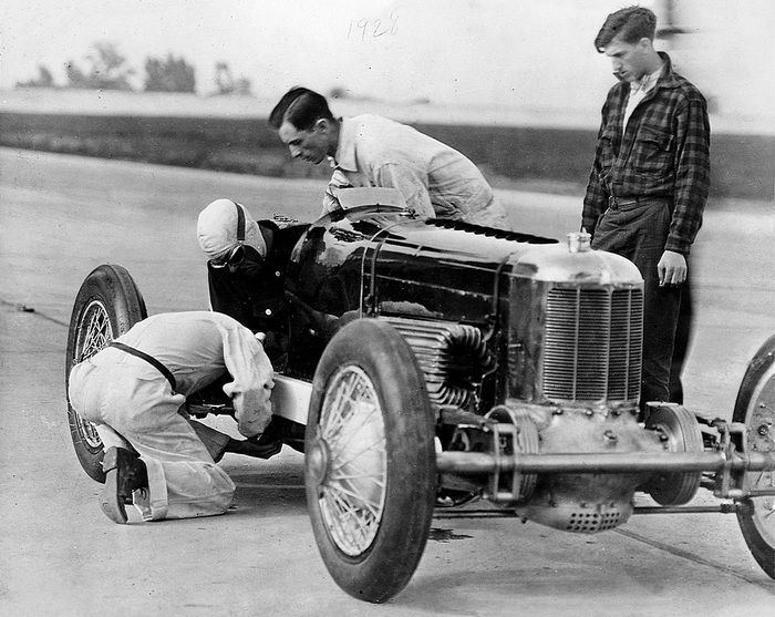Механики готовят к заезду на кольцевой трассе полигона Packard Motor Car Co. в Утике, штат Мичиган, гоночный болид Miller 91 пилота Леона Дюрея, 14 июня 1928 года. Тормоза вынесены к главной передаче — у колёс им просто не осталось места. В «конюшне» фирмы Packard Cable Co. (родственной автомобильному «Паккарду») было три Miller-91, причём один из них — заднеприводный, на всякий случай…