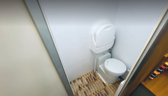 По левой стороне расположены душевая кабина с кассетным туалетом и откидной раковиной. Размеры кабины 1.1х1 метр. Очень просторно.
