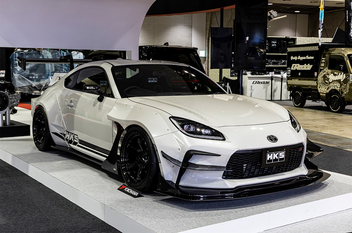 Заднеприводные спорткары-близнецы Toyota GR86 и Subaru BRZ стояли на стендах чуть ли не каждой второй тюнинг-мастерской. Машины чрезвычайно популярные! Вот и тюнинг-гигант HKS представил на суд петролхедов концепт-кар GT400+, суть тойотовское купе с турбо-китом собственной разработки. На машине установлена турбина GT III RS (отдача оппозита 2.4 повышена до 373 л.с.), установлена подвеска Hipermax R, большие тормоза Endless с шестипоршневыми суппортами, агрессивное оперение HKS Type-R из карбона (передний сплиттер, экстремально расширенные арки, пороги, большое антикрыло на стойках «лебединая шея»). Внутри — сделанные по заказу HKS кресла Bride и руль Nardi.