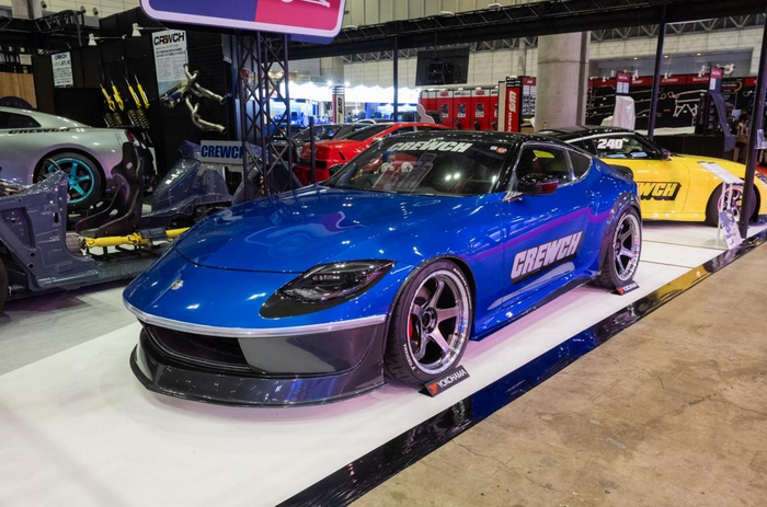 Новое заднеприводное купе Nissan Fairlady Z — тоже в числе самых востребованных спорткаров: на выставке мы насчитали 17 штук! Из них больше всего нам понравился вот этот проект небольшой мастерской Crewch. В первую очередь за внешность: вытянутый стреловидный передок стилизован под редкое омологационное купе Nissan 240ZG 1971 года (его выпустили, чтобы обтекаемый нос разрешили использовать в гонках). Задние фонари переделаны в ретро-духе — хромированные вставки сделали их похожими на Fairlady Z первого поколения (S30). С техникой тоже поработали: отдачу трёхлитрового турбомотора VG30DDTT подняли до 500 л.с.