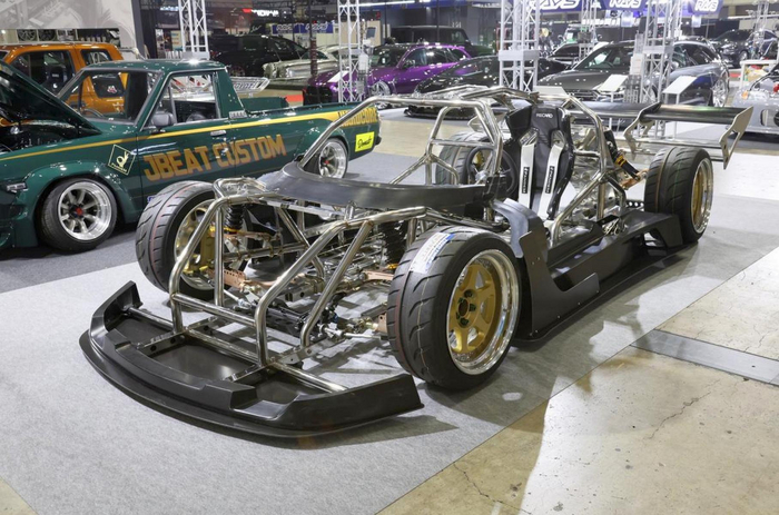 А вот эта конструкция из труб — специальное дрифтовое шасси фирмы T.R.A. Kyoto. Создатели присвоили ему индекс 787D, поскольку считают его своего рода наследником ле-мановского прототипа Mazda 787. Каким этот дрифт-болид будет в собранном виде? Это мы уже видели пару месяцев назад, когда новозеландский дрифтер «Мэд Майк» Уиддет показал публике аналогичную машину. Внешне она действительно смахивает на ле-мановскую технику, но устроена совсем иначе: уникальный пятироторный (!) двигатель установлен спереди, а шасси собрано из труб (в отличие от монокока на прототипе Mazda).