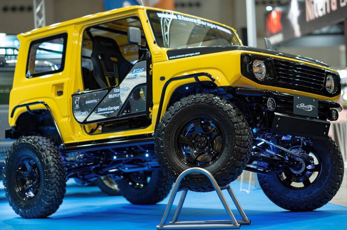 Микровнедорожничек Suzuki Jimny, подготовленный мастерской Showa Garage для джип-триала. Колёса M/T внешним диаметром 31,7 дюйма — для такой крохи это огромный размер. В подвеске установлены длинные пружины и амортизаторы собственной разработки, в мостах — блокировки ARB с пневматическим включением. Внутри смонтирован каркас безопасности, а все двери демонтированы — вместо них простые «калитки» из труб. И всё это приводит штатный моторчик объёмом всего 660 «кубиков», мощность которого чипом довели до 98 л.с.