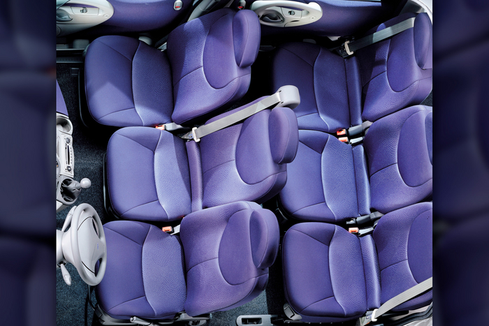 Multipla, как и Bravo/Brava построенная на тележке FIAT C1 — сразу заходила с козыря. В салоне итальянца было шесть мест — по три индивидуальных кресла в каждом из рядов. Не забудем и про огромный запас воздуха над головой и в ногах — спасибо вертикальной посадке, высокой крыше и большой габаритной ширине: плюс 16 см к тому же «Сценику».