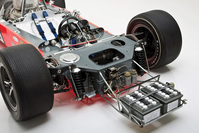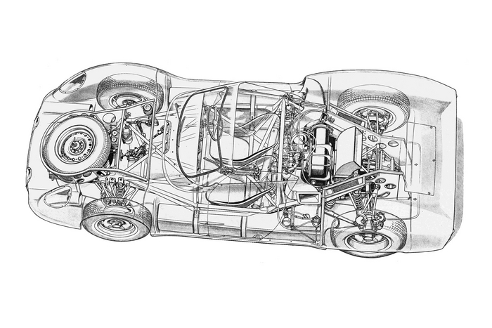Двигатель Pratt&Whitney от прошлогодней машины остался почти без изменений, разве что переехал на традиционное место позади пилота, сохранилась и полноприводная трансмиссия. А вот само шасси получилось революционным: с клиновидным силуэтом, увеличивающим прижим, хитрющей кинематикой подвесок — и, конечно, максимальным облегчением везде, где только можно. В результате Lotus 56 весил всего 625 кг, прекрасно управлялся и показывал отличный темп, вообще не замечая новые регламентные ограничения.