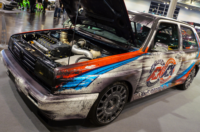 Автором главного шоу-стоппера в Эссене уже который год становится мастерская JP Performance местной телезвезды — ведущего реалити-шоу, а теперь популярного видеоблогера Жан-Пьера Кремера. Ребята из Дортмунда взялись за постройку отвязного проекта на основе Volkswagen Golf третьего поколения. Сразу скажем: от «Гольфа» там осталось немного — кузов распилили пополам, насадив на пространственную раму из стальных труб, также выполняющую функцию каркаса безопасности. Перед задней осью установили силовой агрегат от суперкара Audi R8 — двигатель V10 5.2 вместе с коробкой передач-«роботом» и системой полного привода. Но этим «Джей-Пи» не собирается ограничиваться: уже в ближайшее время его оборудуют парой турбин (на Audi RS6 C6 похожий турбомотор V10 развивал как миниум 579 л.с.). Двухрычажные подвески тоже собраны из компонентов Audi, регулируемые амортизаторы — фирмы KW suspension.