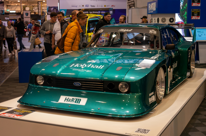 Другой шоу-стоппер нынешней выставки в Эссене — вот этот крылатый «бэтмобиль» от мастерской Holyhall, стилизованный под легендарный Ford Capri группы 5 команды Zakspeed. Конечно, глубокой инженерной проработкой здесь не пахнет — машину полтора года строила группы друзей в небольшом автосервисе в Тюрингии. «Черновой макет» пространственной рамы варили по месту, просто сверяясь с фотографиями шасси настоящего Zakspeed Capri и аккуратно промеряя кузов. Но восхищение зрителей и внимание журналистов машина привлекала ничуть не меньше Гольфа от Жан-Пьера Кремера, на который потратили свыше трёхсот тысяч евро!