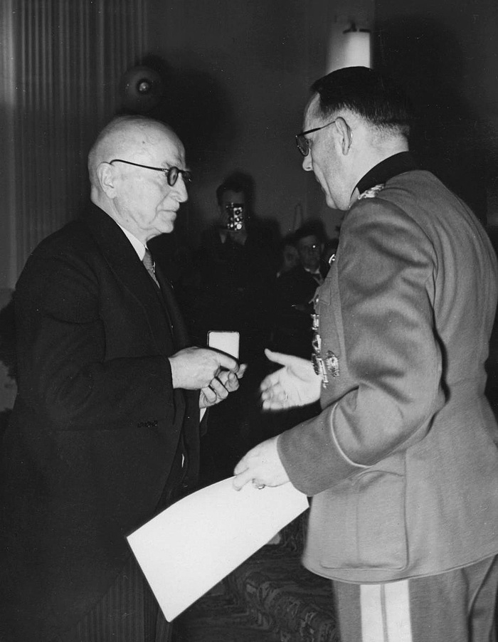Генерал-майор фон Шелль вручает Вильгельму фон Опелю крест «За военные заслуги» (Kriegsverdienstkreuz) 1‑й степени. 1941 год.