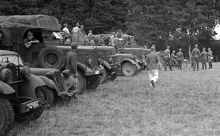 Типичная автоколонна вермахта на привале, слева направо: заднеприводный «кюбельваген» Wanderer W 11, трофейный переднеприводный Citroen 7 CV, полноприводная полуторка Einheits-Diesel, трехтонка Henschel Typ 33 D1 (6x4), еще один «вандерер», еще один «типовой дизель»…
