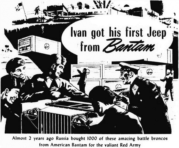 Реклама American Bantam Car Company: «Почти два года назад Россия приобрела 1000 этих замечательных боевых жеребцов у American Bantam для доблестной Красной Армии».