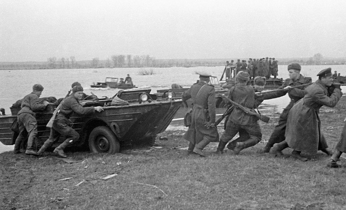 Амфибии Ford GP-A американцам не пригодились, поскольку не держали океанскую волну. У нас же их широко использовали с 1944 года при форсировании рек и озер, а Балтфлот даже провел испытания на море. К нам поступило 3520 штук. На снимке В. Боровского момент форсирования Одера. Видно, как отсутствие блокировки межколесного дифференциала затрудняет выход на берег (одно колесо замерло, другое беспомощно крутится).