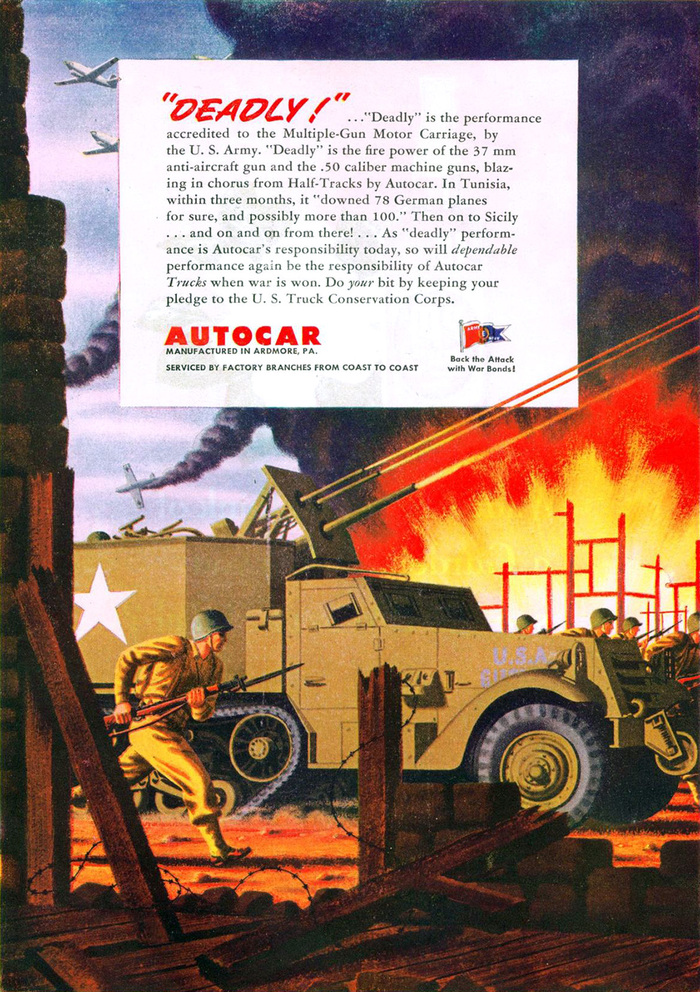 Совершенно новым типом техники стали для СССР бронетранспортеры (M2, M3, M9, M3A1 Scout) и боевые машины на их базе (M15A1, M17, T48). В США их выпускали несколько автомобильных заводов. На рекламе — зенитно-самоходная установка M15 с 37‑мм пушкой и двумя 12,7‑мм пулеметами фирмы Autocar. Таких в СССР поступило 100 штук.
