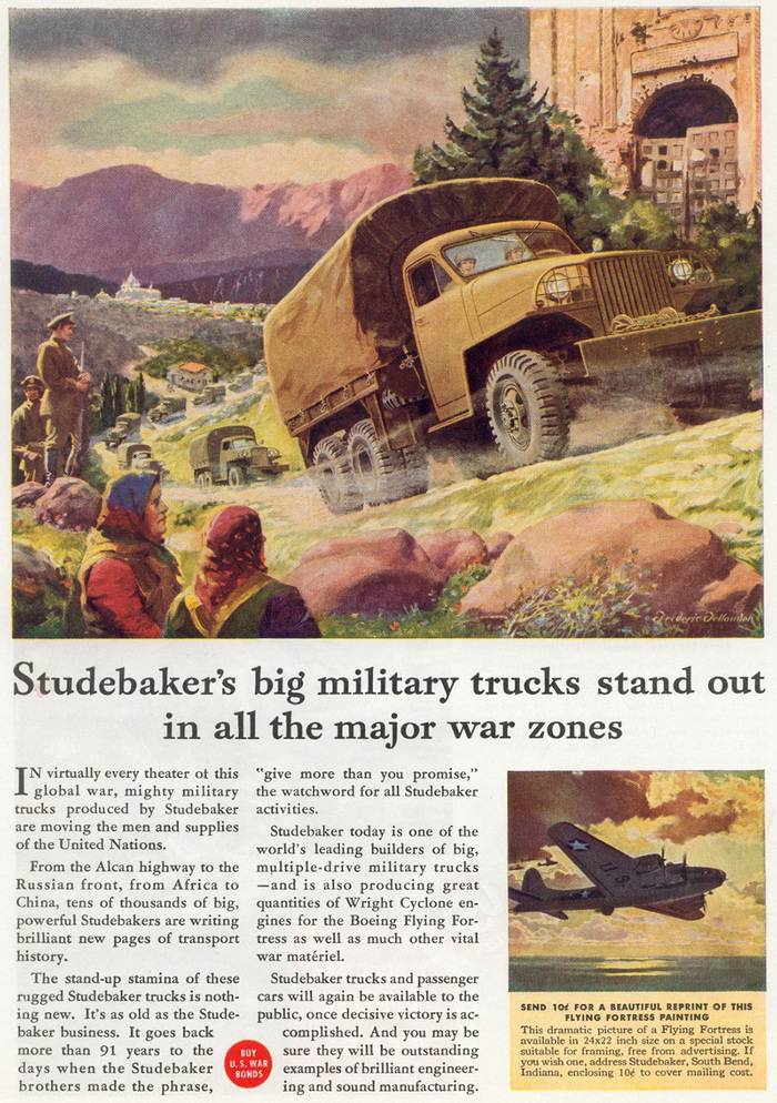 Реклама Studebaker US6. Именно таким в нашей памяти запечатлелся легендарный «Студер», хотя к нам поставлено 114,5 тысяч штук 13 разных модификаций. Фирма также выпускала моторы для знаменитых «летающих крепостей».