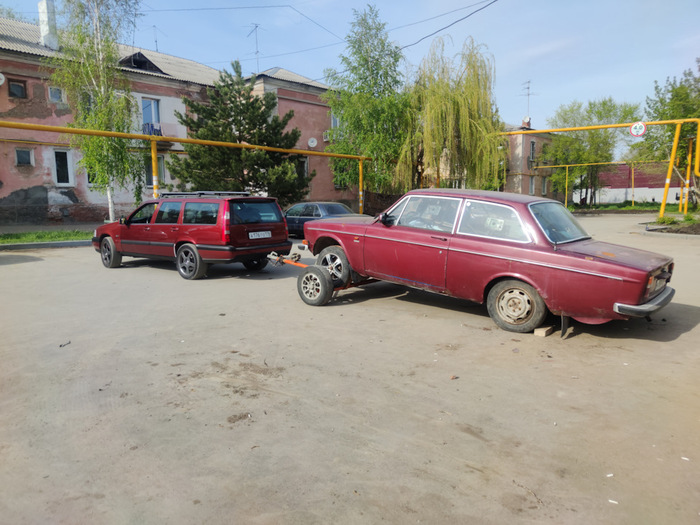Приготовили старушку к погрузке и транспортировке, заменив умершие амортизаторы, чтобы не стереть её филей об асфальт в пути. Заменили шланг на сарае, Вольво как всегда выручает и нашелся тормозной шланг от 9 серии, который прекрасно подошел и мы вернули в строй тормозилки. Заменили на подкате все болты на нормальные, православные от Вольво, подкачали всем колеса и загрузили автомобили.
