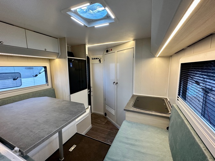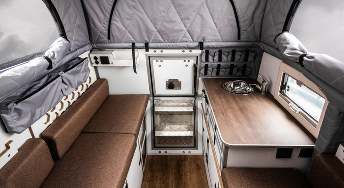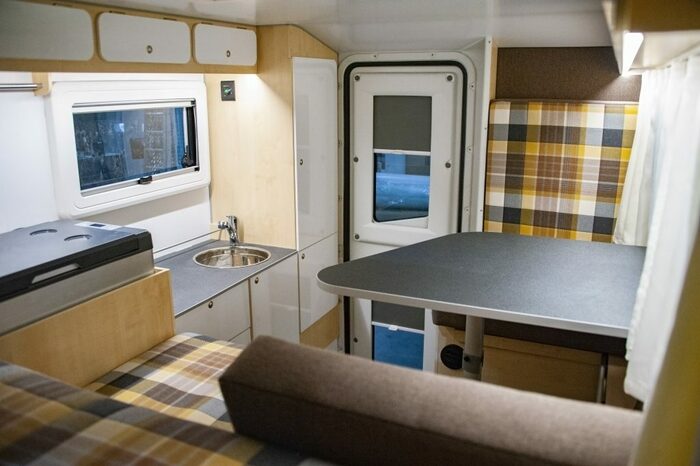 Как видно по фото все довольно сурово, хотя вживую я видел разные интерьеры и встречал довольно уютные. Но все же это экспедиционная капсула больше, чем кемпер в полном смысле этого слова. Ширина не более 1,6 метра, высота 1,7 м. Кровать для сна нужно раскладывать. Выдвигать вперед.