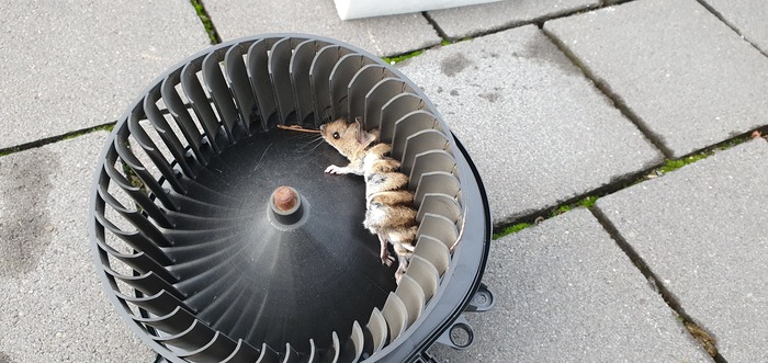Во время движения сильно завибрировала передняя панель. Виновницей была объявлена клима. Снял крышку проверить подозрение на сломанный электромотор, а там мышь на "карусели' катается.