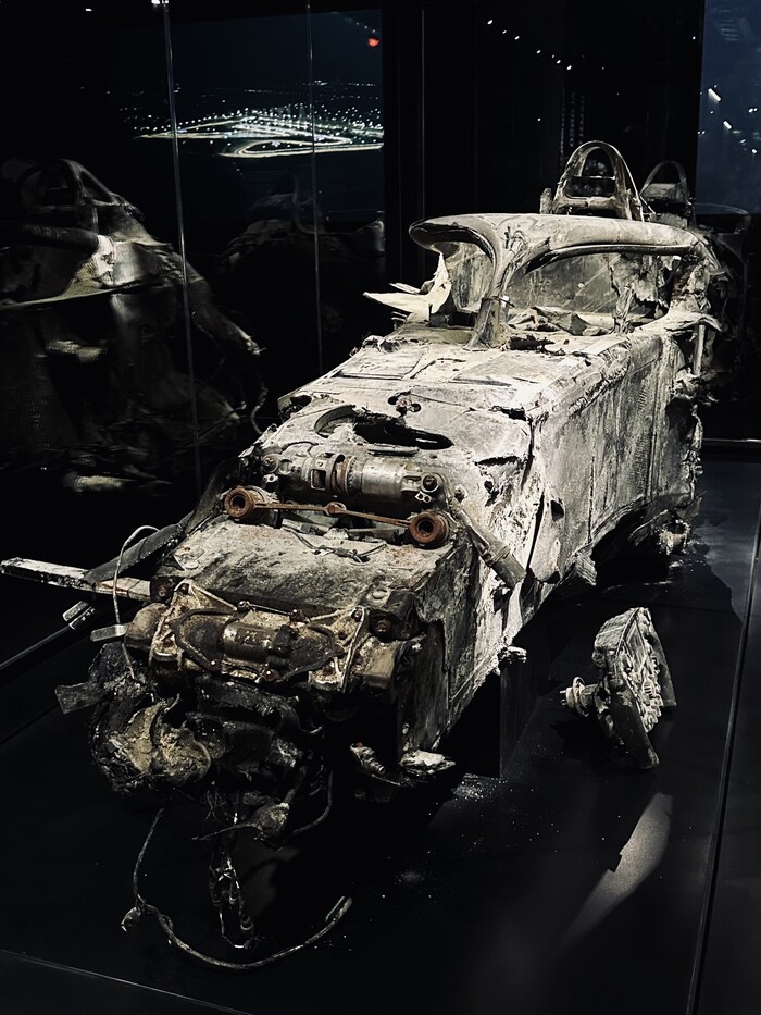 Сгоревшее шасси, оставшееся от болида Ромена Грожана и руль — все экспонаты зала. Зал большой, немногословная экспозиция оставляет время задуматься о бытие.